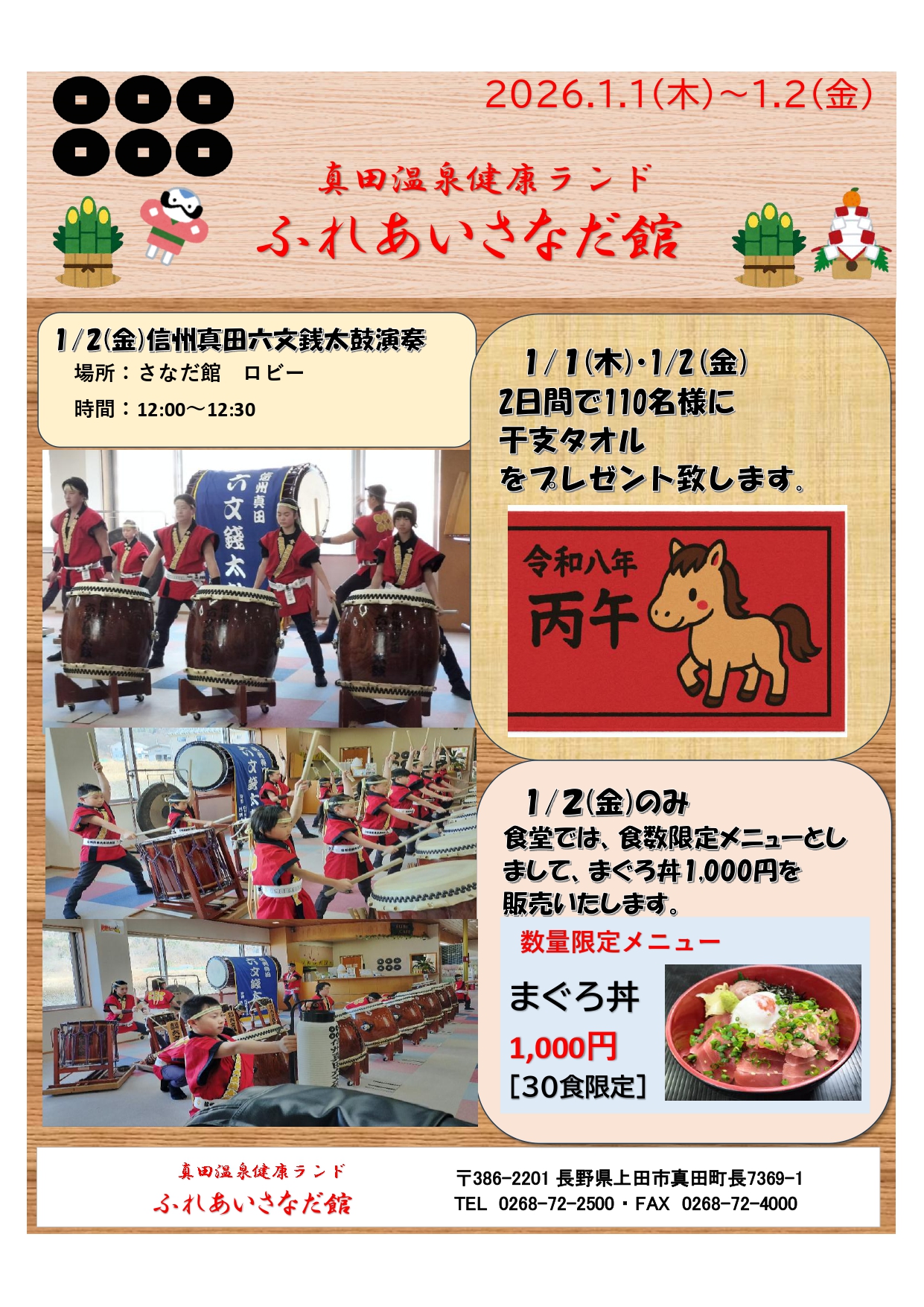 いつも真田温泉健康ランドふれあいさなだ館をご利用いただきありがとうございます。お正月イベントを開催いたしますのでお知らせいたします。