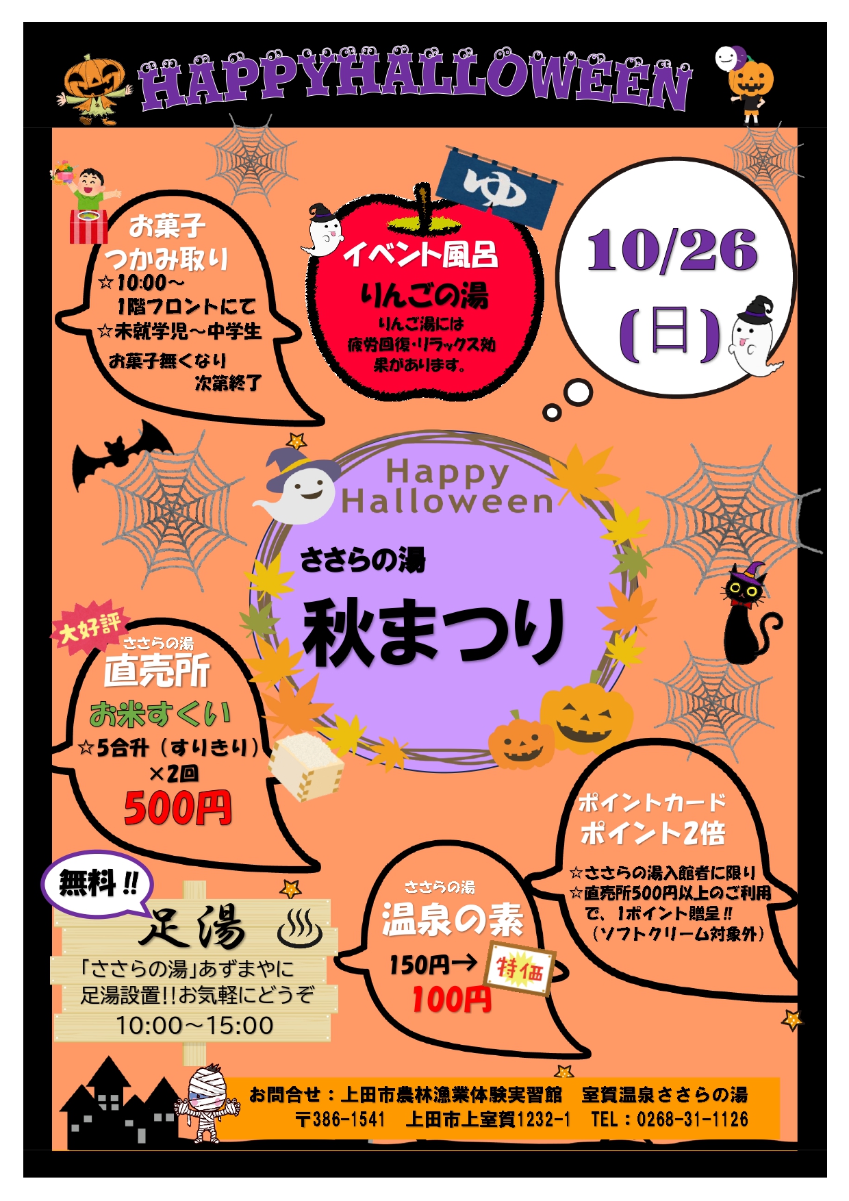 上田市農林漁業体験実習館 ささらの湯において以下の内容で「ハロウィンイベント 秋まつり」を開催いたします。