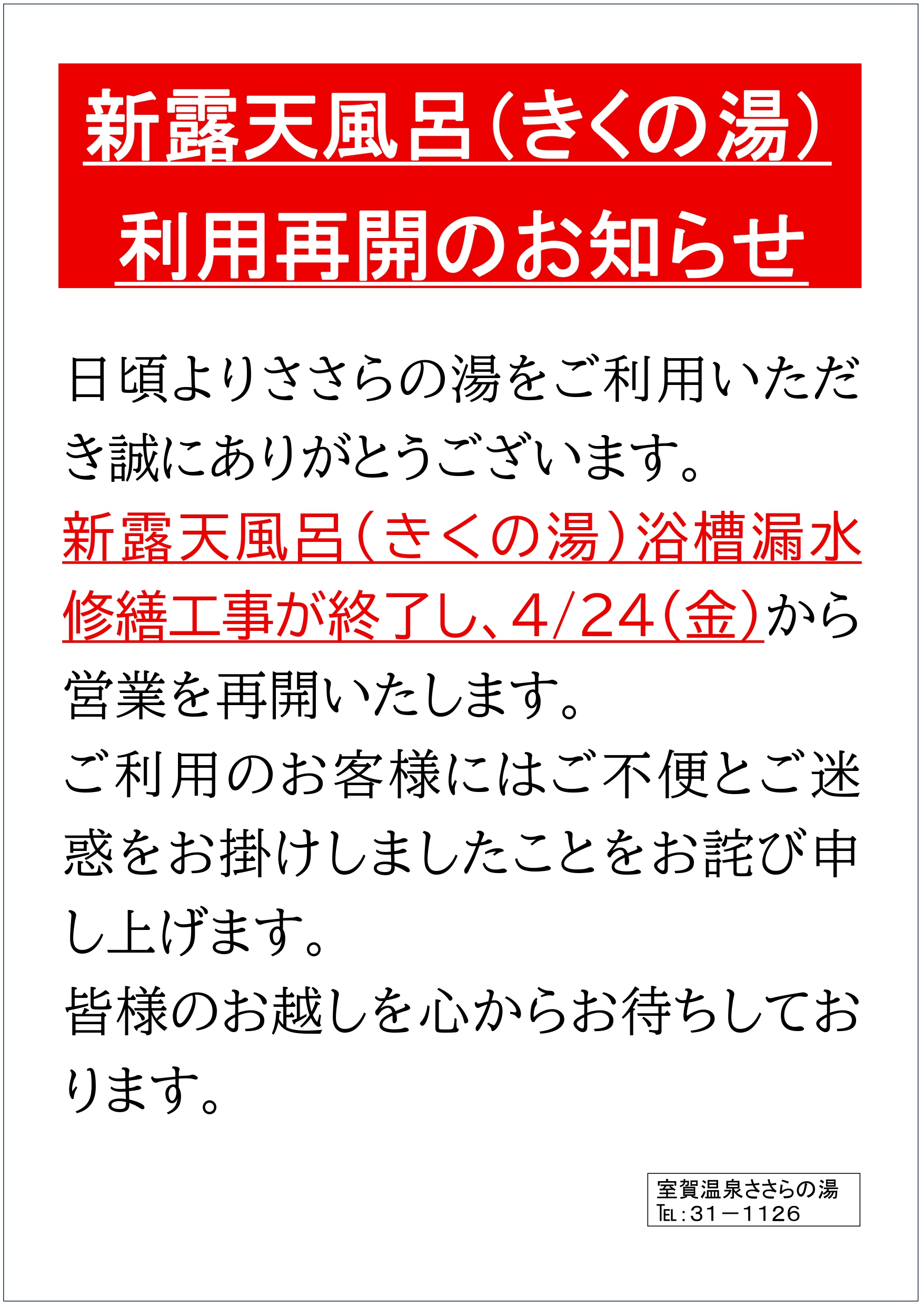 ささらの湯 新露天風呂(きくの湯)利用再開のお知らせ 投稿日時: 2026.04.22 | 17:36:55 上田市農林漁業体験実習館 ささらの湯をいつもご利用いただき誠にありがとうございます。 新露天風呂(きくの湯)の浴槽漏水修繕工事が終了し、令和8年4月24日(金)から利用を再開いたします。ご利用のお客様にはご不便とご迷惑をお掛けしましたことをお詫び申し上げます。皆さまのお越しを心からお待ちしております。 PDF お問合せ 〒386-1541 長野県上田市上室賀1232-1上田市農林漁業体験実習館 室賀温泉ささらの湯TEL 0268-31-1126 FAX 0268-31-1144