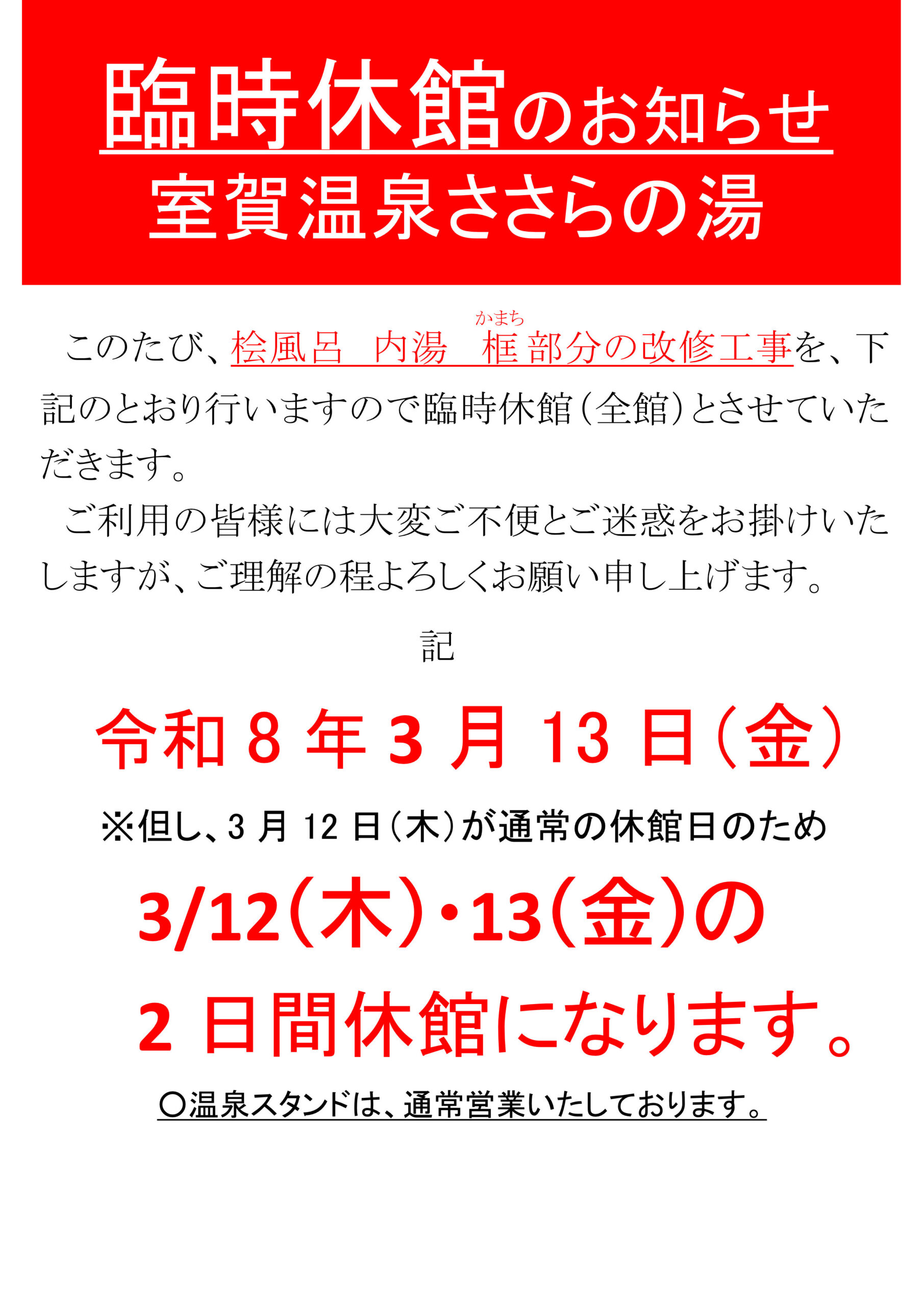 このたび、桧風呂 内湯 框(かまち)部分の改修工事をするため、下記の日程にて臨時休館(全館)とさせていただきます。