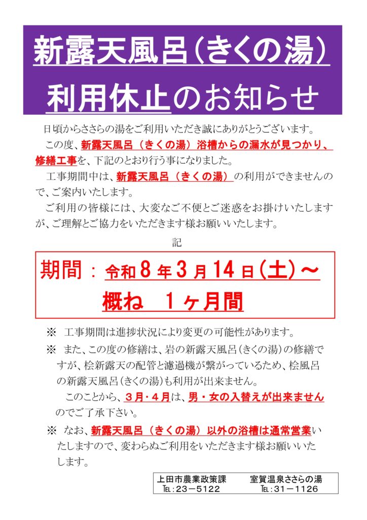 いつも上田市農林漁業体験実習館 室賀温泉ささらの湯をご利用いただき誠にありがとうございます。