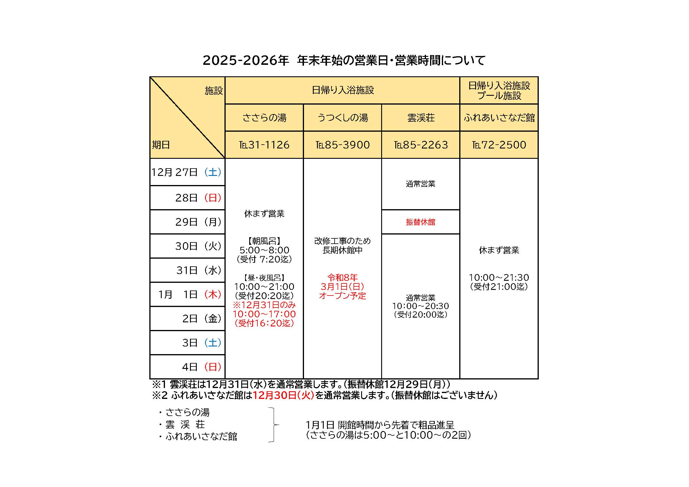2025-2026年 年末年始の日帰り入浴施設営業日・営業時間について